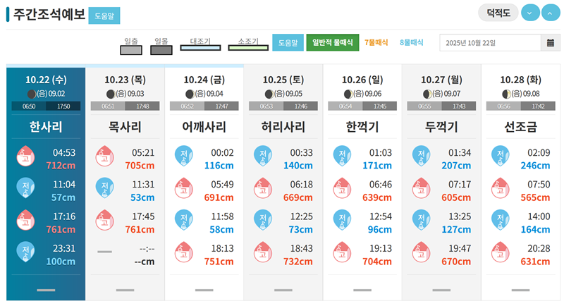 6. 주간 단위의 물때 흐름을 보고 싶을 때는 '주간조석예보'를 확인하면 편리합니다. 한 주 동안의 고조 및 저조 시각과 함께 한사리, 조금 등 물때의 세기를 나타내는 용어까지 표시되어 있어 바다 활동 계획을 더욱 체계적으로 세울 수 있습니다.