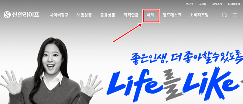 1. 홈페이지 상단에 있는 여러 항목 중에서 '혜택'을 찾아 들어갑니다. 이곳에서는 일상에 유용한 다채로운 생활 편의 서비스들을 한눈에 확인하고 이용해볼 수 있어 편리합니다.
