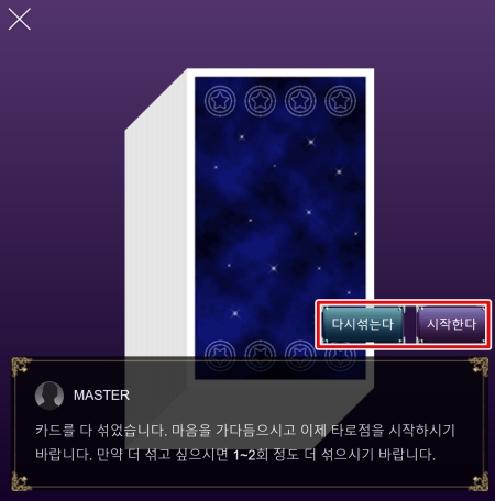 6. 카드 섞기가 완료되면 이제 타로점을 시작할 준비가 된 것입니다. 만약 카드를 더 섞고 싶다면 '다시섞는다'를, 바로 결과를 보고 싶다면 '시작한다'를 선택하여 다음 과정으로 진행할 수 있습니다.
