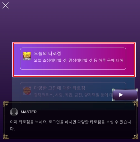 3. 안내가 끝나면 오늘의 운세나 다양한 고민 중 원하는 주제를 선택할 수 있습니다. 하루의 전체적인 흐름이 궁금하다면 '오늘의 타로점'을 골라 운세를 확인해 보는 것이 좋습니다. 로그인을 하면 더 많은 서비스를 이용할 수도 있습니다.