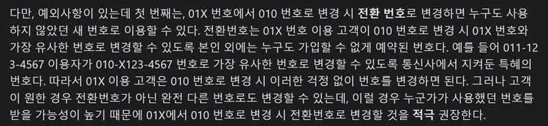 5. 기존 01X 번호 사용자가 010으로 변경할 때의 불편을 줄여주기 위해 '전환 번호' 제도가 마련되었습니다. 이는 기존 번호와 가장 유사한 010 번호를 우선적으로 변경할 수 있도록 예약해주는 방식입니다. 예를 들어 011-123-4567 사용자는 010-X123-4567과 같이 최대한 비슷한 번호를 받을 수 있어, 번호 변경에 대한 거부감을 줄일 수 있었습니다.