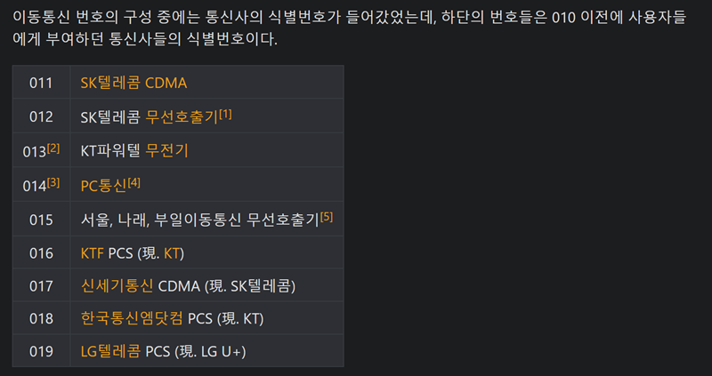 1. 대한민국의 휴대폰 식별번호는 원래 011부터 019까지 통신 사업자별로 나뉘어 사용되고 있었습니다. 하지만 모든 번호가 포화 상태에 이르면서 신규 가입자에게 부여할 번호가 부족해지는 문제가 발생했고, 이를 해결하기 위해 모든 휴대폰 번호의 앞자리를 010으로 통합하게 되었습니다.