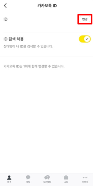 4. 카카오톡 ID 메뉴로 들어가면 내 아이디를 확인할 수 있어요. 마음에 안 들면 변경 버튼으로 새로 만들 수도 있어요.