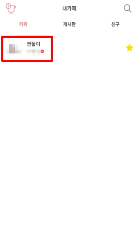3. 앱이 실행되면 가입한 카페 목록이 보입니다. 이 중에서 닉네임을 변경하고 싶은 카페를 찾아서 선택해 주세요. 해당 카페의 메인 화면으로 이동하게 됩니다.