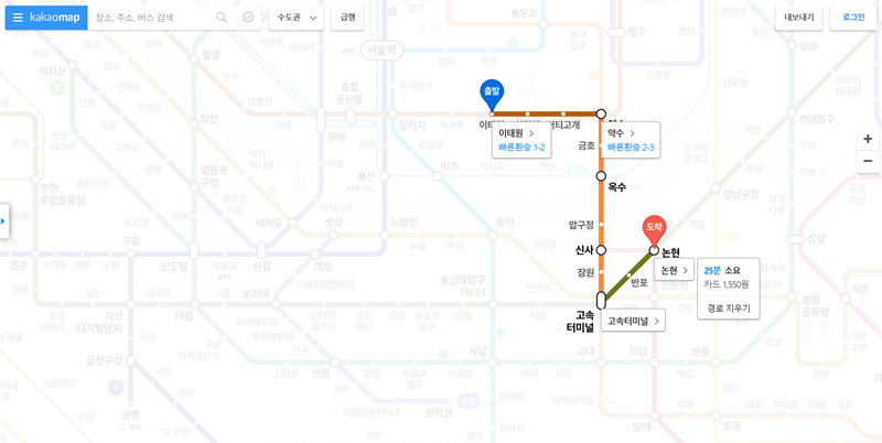 3. 검색을 마치면 지도 위에 출발지와 도착지가 표시되고, 두 역을 잇는 최적의 경로가 나타납니다. 도착지 근처에는 총 소요 시간, 요금, 그리고 빠른 환승을 위한 칸 정보까지 요약되어 표시되어 전체적인 이동 계획을 세우는 데 도움을 줍니다.