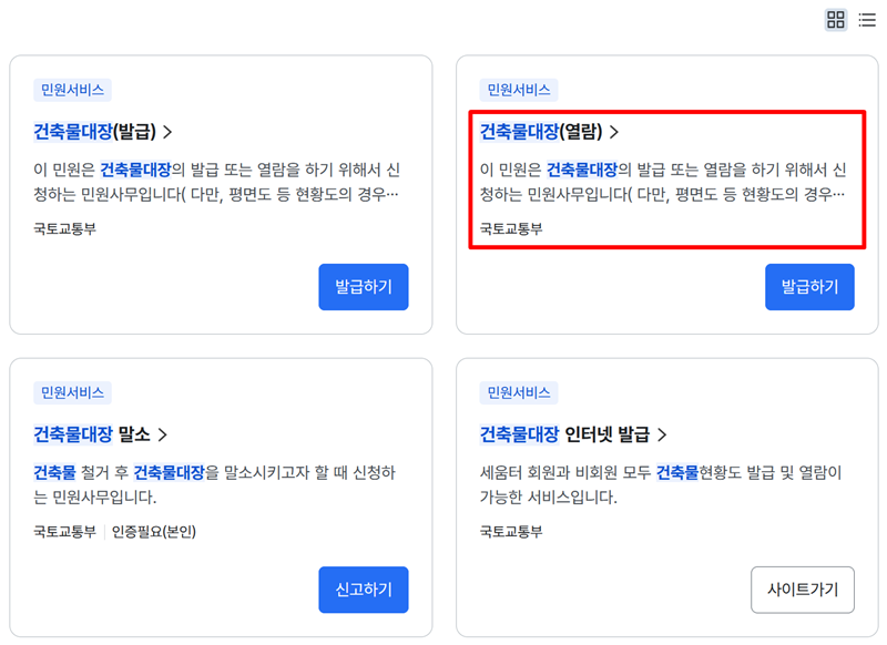 3. 검색 결과 중에서 '건축물대장(열람)' 항목을 선택해 주세요. 발급과 열람은 다른 절차이므로, 단순히 내용을 확인하는 것이 목적이라면 '열람'이라고 표시된 부분을 고르는 것이 맞습니다.