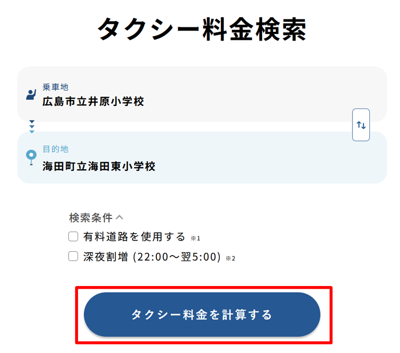 2. 요금 체계를 이해했다면 이제 사이트에 접속해 봅니다. 화면에는 아주 단순하게 두 개의 입력칸이 보이는데, 위쪽은 내가 탈 승차지이고 아래쪽은 내릴 목적지를 적는 곳입니다. 모두 일본어로 되어 있어 당황스러울 수 있지만, 우리가 가려는 장소의 정확한 주소만 넣으면 되므로 크게 걱정할 필요는 없습니다.