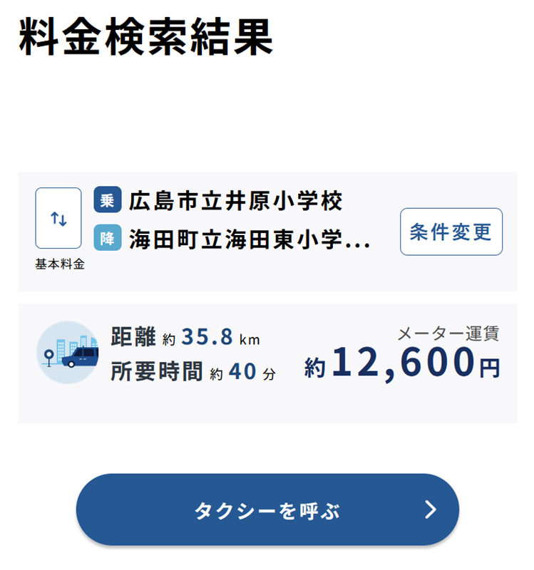 5. 버튼을 누르면 상세한 계산 결과가 화면에 표시됩니다. 총 이동 거리는 얼마인지, 시간은 대략 몇 분이 걸리는지 알 수 있으며 가장 중요한 미터기 예상 운임이 큼지막하게 나옵니다. 약 12,600엔과 같이 구체적인 금액을 미리 알면 현금을 준비하거나 예산을 짤 때 큰 도움이 됩니다.
