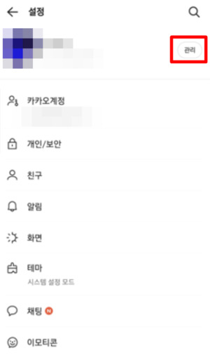 2. 전체설정에 들어가면 내 프로필이 보여요. 프로필 옆에 관리라는 버튼이 있으니 그걸 눌러서 다음 화면으로 넘어가 주세요.