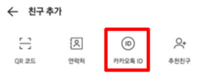7. 친구 추가 화면에서는 연락처 옆에 카카오톡 ID라는 메뉴가 있어요. 이걸 누르면 아이디 찾기 화면이 열려요.