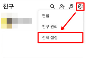 1. 카톡을 켠 다음 오른쪽 위에 있는 톱니바퀴 모양을 눌러주세요. 그러면 설정 화면이 뜨는데 여기서 전체설정으로 들어가면 됩니다.