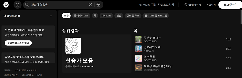 9. 스포티파이의 음악을 감상하기 위해서는 계정이 필요할 수 있습니다. 무료로 가입하여 서비스를 이용하거나, 이미 계정이 있다면 로그인을 통해 바로 원하는 찬송가 플레이리스트를 재생할 수 있습니다.