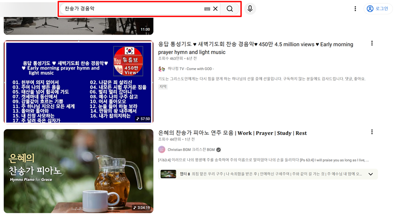 1. 먼저 유튜브 검색창을 통해 '찬송가 경음악'을 찾아보면, 다양한 길이의 음악 모음 영상들을 발견할 수 있습니다. 그중 '새벽기도회 찬송 경음악'처럼 마음에 드는 제목의 영상을 선택해서 감상을 시작할 수 있어요.