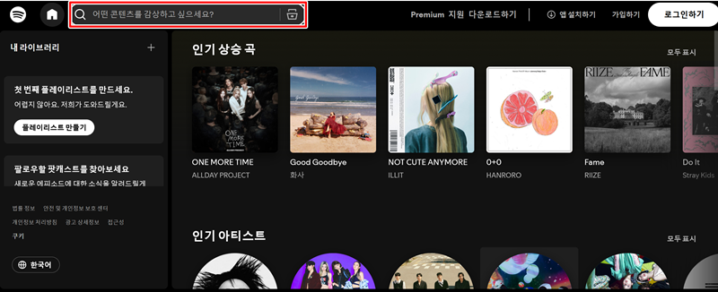 6. 음악 감상 경로를 스포티파이로 바꿔볼 수도 있습니다. 앱을 실행한 뒤 상단의 검색 기능을 활용해 듣고 싶은 콘텐츠가 무엇인지 직접 입력하며 탐색을 시작하면 돼요. 다양한 음악들이 준비되어 있답니다.