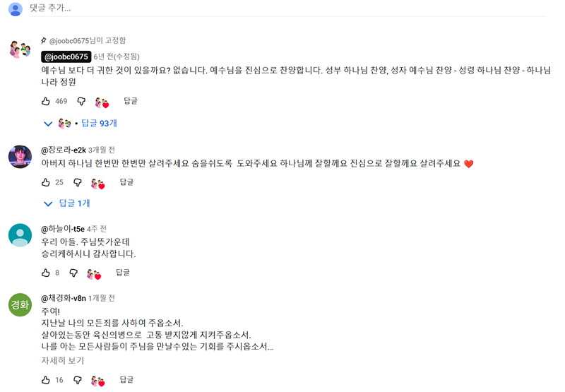 3. 영상 아래의 댓글들을 살펴보면 다른 사람들의 감상평을 볼 수 있어요. '예수님을 진심으로 찬양합니다'와 같은 글들을 통해 영상의 분위기를 미리 짐작해 보거나, 다른 이들과 비슷한 감정을 공유하는 경험을 할 수도 있습니다.