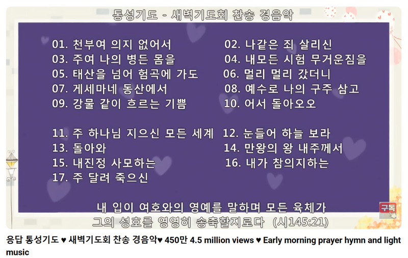 2. 영상의 미리보기 이미지에는 수록된 곡들의 목록이 나와 있는 경우가 많아요. '천부여 의지 없어서'나 '나 같은 죄인 살리신' 등 내가 좋아하는 찬송가들이 포함되어 있는지 미리 확인하고 영상을 고를 수 있어 편리하답니다.