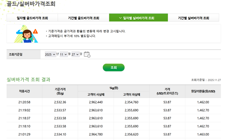 7. 마찬가지로 '일자별 실버바가격 조회' 탭을 선택하면 특정 날짜의 은괴 시세를 개별적으로 확인할 수 있습니다.
