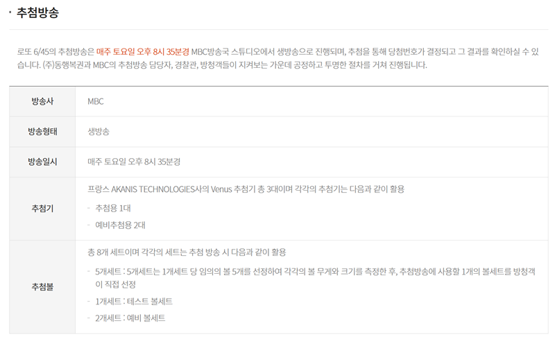 6. 로또 6/45 추첨 방송은 매주 토요일 오후 8시 35분에 MBC에서 생방송으로 진행됩니다. 프랑스 AKANIS TECHNOLOGIES사의 추첨기를 사용하며, 투명한 절차를 통해 번호를 결정합니다.