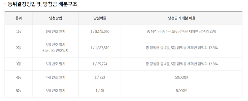 4. 등위별 당첨 결정 방법과 확률에 대한 정보를 볼 수 있습니다. 1등 당첨 확률은 1/8,145,060 (약 0.000012%), 2등은 1/1,357,510 (약 0.000074%), 3등은 1/35,724 (약 0.0028%), 4등은 1/733 (약 0.1364%)입니다.