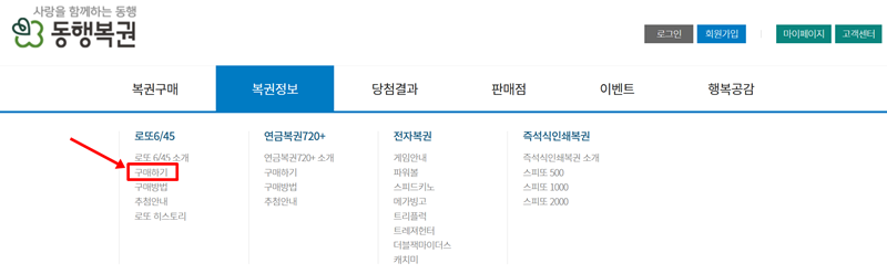 2. 로또 6/45에 대한 정보를 확인하기 위해 '구매하기' 항목을 선택하여 복권 구매와 관련된 페이지로 이동합니다.