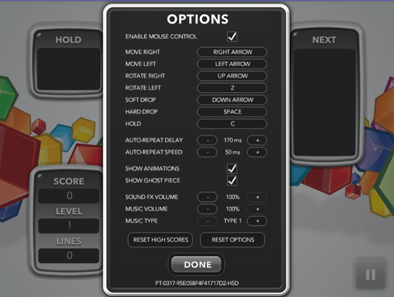 7. 'OPTIONS'에서는 개인의 취향에 맞게 다양한 설정을 변경할 수 있습니다. 마우스 조작 활성화 여부부터 시작해서 각 동작에 대한 키보드 지정, 블록의 움직임 속도, 음량 조절까지 세세한 조정이 가능합니다.