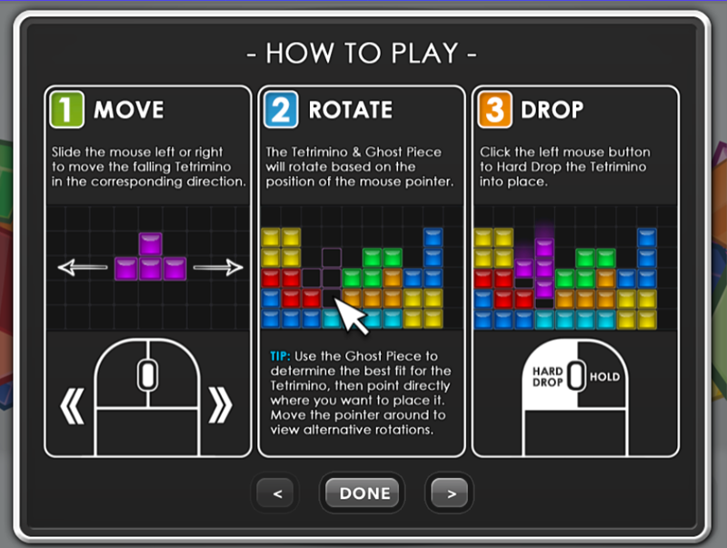 4. 조작 방법이 궁금하다면 'HOW TO PLAY'에서 확인할 수 있습니다. 마우스를 좌우로 움직여 블록을 이동시키고, 마우스 포인터의 위치에 따라 블록을 회전시키며, 마우스 왼쪽을 누르면 블록을 빠르게 아래로 내릴 수 있습니다.