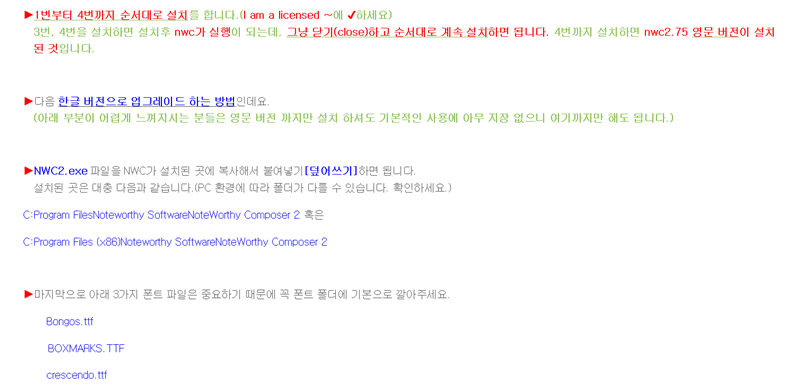 5. 자세한 설치 순서가 안내되어 있습니다. 1번부터 4번까지 순서대로 파일을 실행하고, 한글 버전으로 만들기 위해 'NWC2.exe' 파일을 덮어쓰기 해야 합니다. 마지막으로 폰트 파일까지 설치하면 모든 과정이 마무리됩니다.
