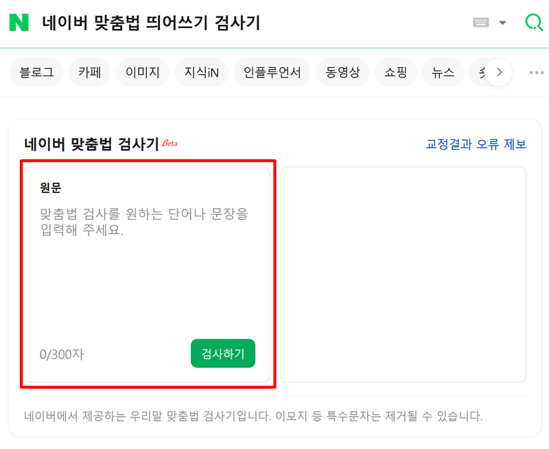 1. 네이버 맞춤법 검사기 페이지에 접속하면 텍스트를 입력할 수 있는 큰 창이 보입니다. 이곳에 교정을 원하는 단어나 문장을 직접 타이핑하거나 복사하여 붙여넣을 수 있습니다.