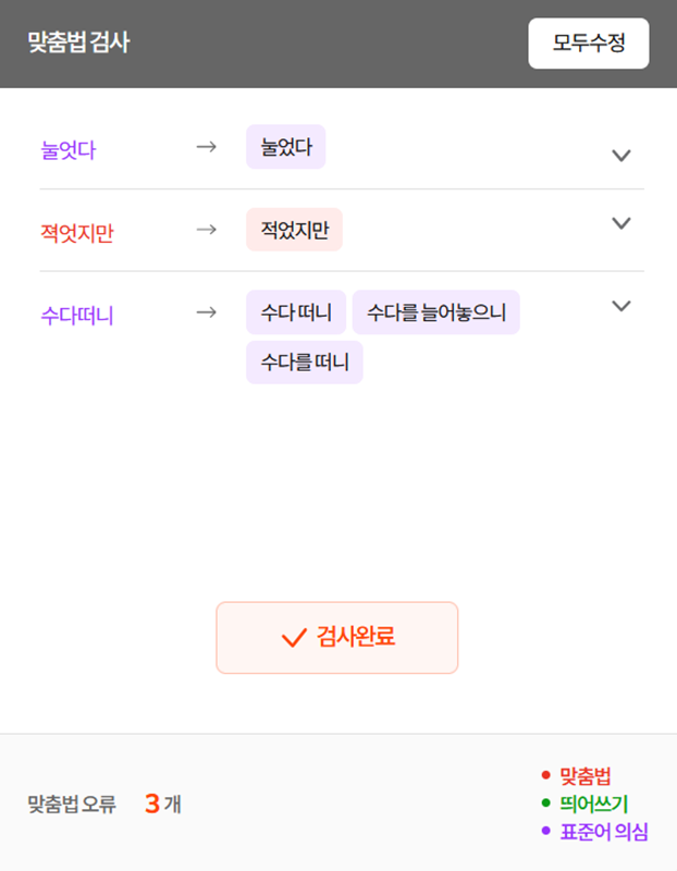 7. 검사 결과는 틀린 부분과 추천 수정안이 목록 형태로 자세하게 나타납니다. '놀었다', '적었지만' 등 각 오류를 개별적으로 수정하거나 '모두 수정'을 통해 한 번에 적용할 수 있습니다.