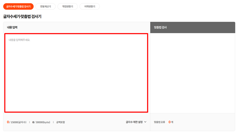 5. 인크루트의 글자 수 세기/맞춤법 검사 페이지 역시 넓은 입력창을 갖추고 있습니다. 네이버 검사기보다 더 긴 글을 한 번에 검사할 수 있다는 장점이 있습니다.