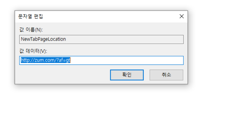 5. 해당 값을 더블클릭하면 문자열 편집 창이 나타납니다. 여기서 '값 데이터'에 입력된 ZUM 주소를 삭제하거나 원하는 다른 주소로 변경한 후 확인을 눌러주면 강제로 설정된 시작페이지가 변경됩니다.