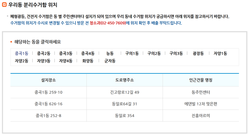 6. 우리 동네 분리수거함의 위치는 동별로 상세하게 안내되어 있습니다. 표에서 자신이 거주하는 동을 선택하면 가까운 수거함의 설치 장소와 도로명 주소를 쉽게 확인할 수 있으며, 주로 동주민센터와 같은 곳에 비치되어 있습니다.