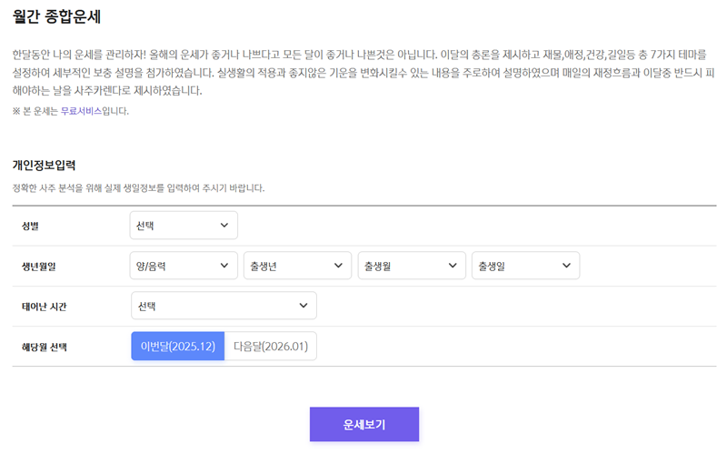 5. 월간 종합운세를 보기로 했다면, 정확한 풀이를 위해 자신의 성별과 생년월일, 태어난 시간 등의 정보를 입력해야 합니다. 정보를 모두 넣고 아래의 '운세보기'를 누르면 해당 월의 풀이를 바로 확인할 수 있습니다.