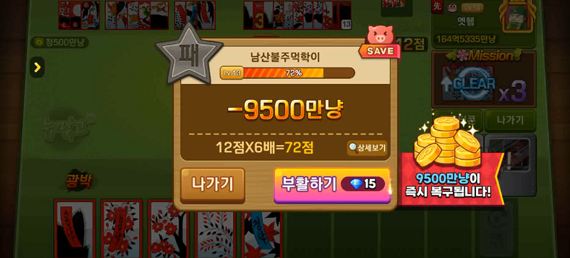 7. 한 판이 끝나면 결과 화면이 나타납니다. 여기서 내가 얻거나 잃은 점수와 금액을 확인할 수 있으며, '나가기'를 선택하여 대기실로 돌아가거나 아이템을 사용해 바로 다음 판을 이어갈 수 있습니다.
