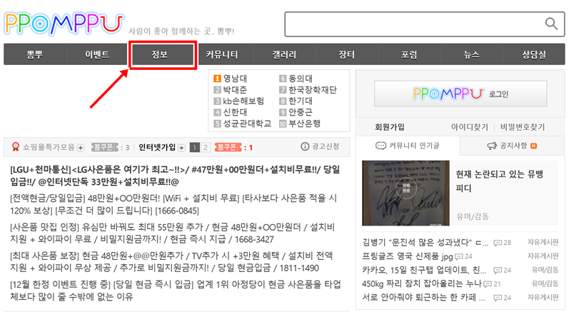 1. 뽐뿌 홈페이지 상단 메뉴에서 '정보'를 찾아 선택하면 다양한 하위 메뉴가 나타납니다. 여러 가지 유용한 정보들이 모여 있는 곳으로, 여기서 원하는 서비스를 찾을 수 있습니다.