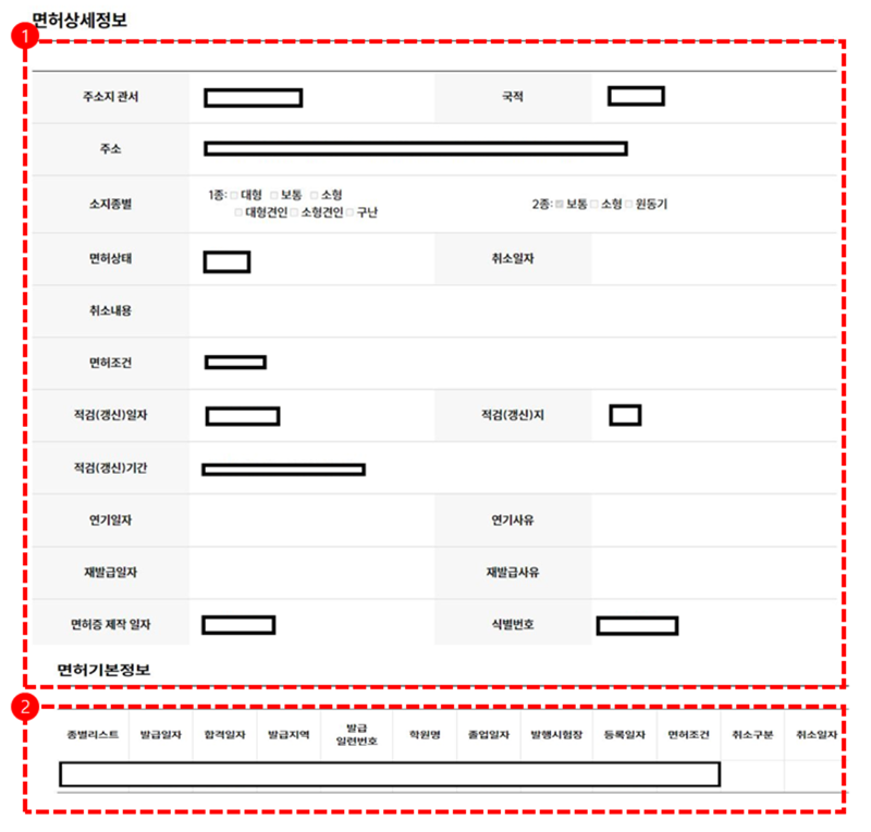 5. 조회가 완료되면 해당 운전면허증에 대한 상세 정보를 한눈에 볼 수 있습니다. 면허의 상태나 취소 여부, 재발급 내역 등 면허와 관련된 기본 정보와 세부적인 내용들을 모두 확인할 수 있습니다.