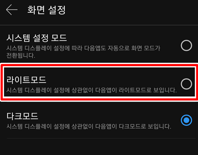 7. 화면 설정에서는 시스템 설정 모드, 라이트모드, 다크모드 중에서 고를 수 있습니다. 어두운 화면을 끄고 싶다면 '다크모드' 대신 '라이트모드'를 선택하면 됩니다.