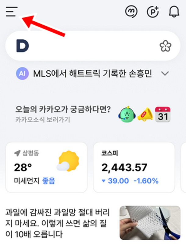 4. 이번에는 스마트폰의 다음 앱을 기준으로 설명해 드릴게요. 앱을 실행한 뒤 왼쪽 위에 있는 가로줄 세 개 모양의 전체 메뉴를 열어주세요.