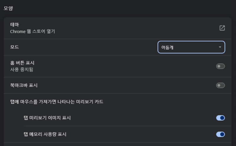 2. 설정 화면 왼쪽 목록에서 '모양'을 찾아 선택합니다. 그러면 오른쪽에 '모드'라는 항목이 보일 텐데, 여기서 현재 '어둡게'로 되어 있는 부분을 선택해 주세요.