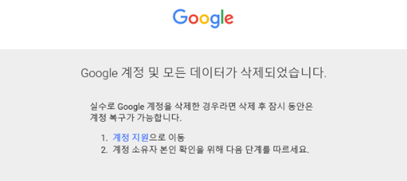 7. 모든 과정이 완료되면 계정 및 모든 데이터가 삭제되었다는 안내 화면이 나타납니다. 이로써 구글 계정 삭제 절차가 마무리됩니다.