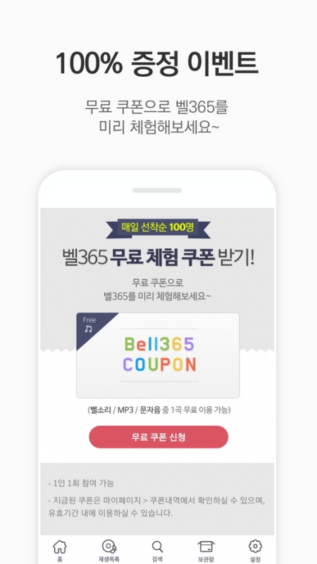 2. 매일 선착순 100명에게 주어지는 무료 체험 쿠폰을 활용해 보세요. 벨소리, 컬러링, MP3 중 원하는 한 곡을 비용 부담 없이 미리 경험해 볼 수 있는 좋은 기회입니다.