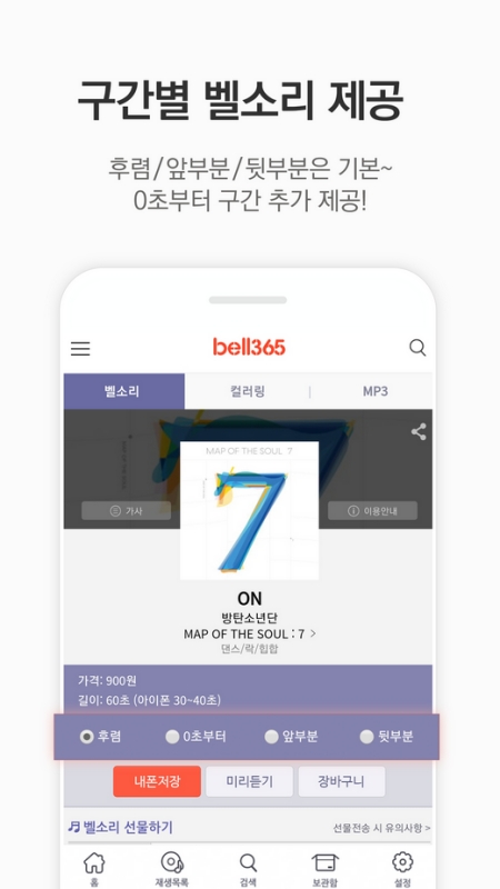 5. 노래 한 곡을 통째로 설정하는 것이 아니라, 하이라이트인 후렴 부분이나 원하는 앞, 뒷부분 등 특정 구간을 직접 선택하여 벨소리로 지정할 수 있어 유용합니다.