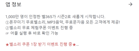 7. 앱 정보 요약을 통해 알 수 있듯이, 많은 사람이 이용하는 벨365는 시즌2로 새롭게 시작하며 모든 고객에게 무료 벨소리, MP3, 문자음과 같은 다양한 혜택을 제공합니다.