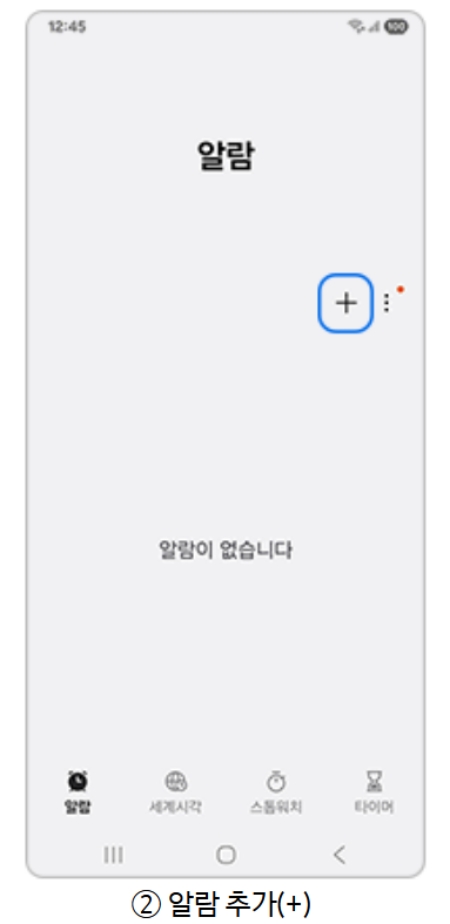 2. 앱에 들어가면 하단에 여러 항목이 있는데 알람이 선택된 상태에서 화면의 + 표시를 눌러 새로운 알람을 추가할 수 있습니다.