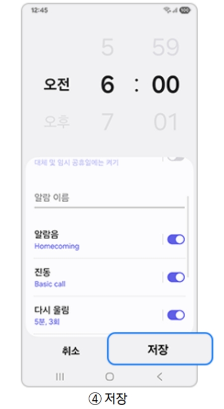 3. 원하는 시간을 설정한 뒤 아래에서 알람 이름이나 소리, 진동, 다시 울림 간격 등 세부적인 내용을 원하는 대로 조절해 주세요.