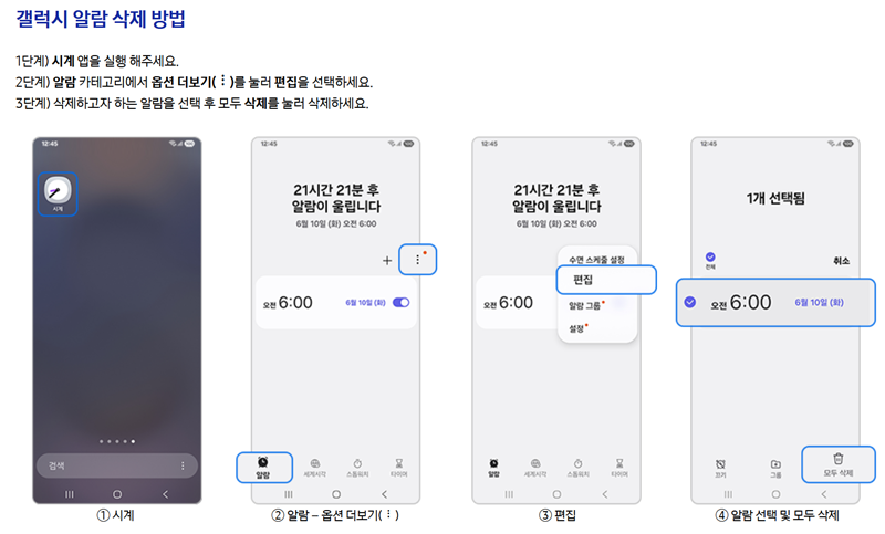 5. 더 이상 필요 없는 알람을 완전히 지우고 싶을 때는 알람 목록 화면 오른쪽 위에 있는 점 세 개 모양을 누르고 편집으로 들어가세요. 이후 삭제할 알람을 선택하고 모두 삭제를 진행하면 됩니다.