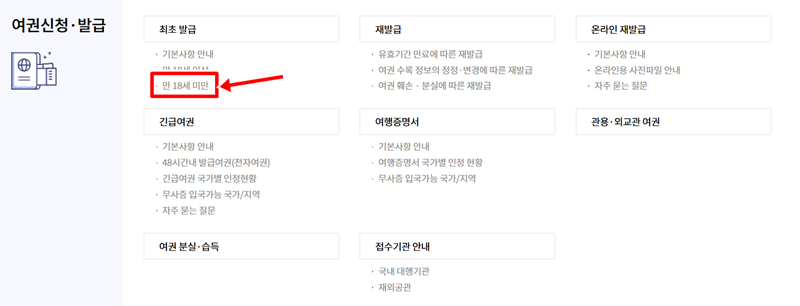 2. 화면이 바뀌면 왼쪽 사이드 메뉴나 중앙의 안내 박스에서 세부 항목을 고를 수 있어요. 최초 발급 카테고리 아래에 있는 만 18세 미만 항목을 찾아 선택해 주세요. 아이들은 아직 성인이 아니기 때문에 별도로 구분된 이 항목에서 정확한 정보를 얻어야 해요.
