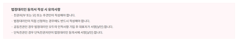 4. 법정대리인 동의서를 작성할 때는 유의할 점이 있어요. 친권자인 부모나 후견인이 작성해야 하며 공동친권인 경우에는 부모 모두의 인적 사항을 적고 대표자가 서명을 해야 해요. 만약 부모 중 한 분만 친권을 가지고 있다면 단독 친권자만 서명하면 되니 가정 상황에 맞게 작성해 주세요.