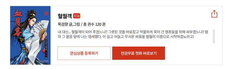 3. 읽고 싶은 만화를 정했다면, 해당 작품의 그림을 눌러 상세 정보 화면으로 넘어가 주세요. 이곳에서 '전권무료 첫화 바로보기' 부분을 선택하면 곧바로 감상을 시작할 수 있습니다.