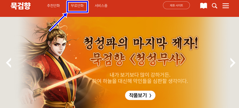 1. 묵검향 홈페이지에 들어가시면 상단에 여러 목록이 보입니다. 그중에서 '무료만화'라고 쓰인 부분을 찾아 선택하면, 비용 없이 볼 수 있는 작품들이 있는 곳으로 바로 이동합니다.